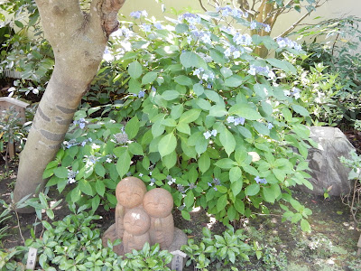 長谷寺の境内には鉢植えのアジサイが並び、下境内の緑陰の庭にもアジサイが植えられています。